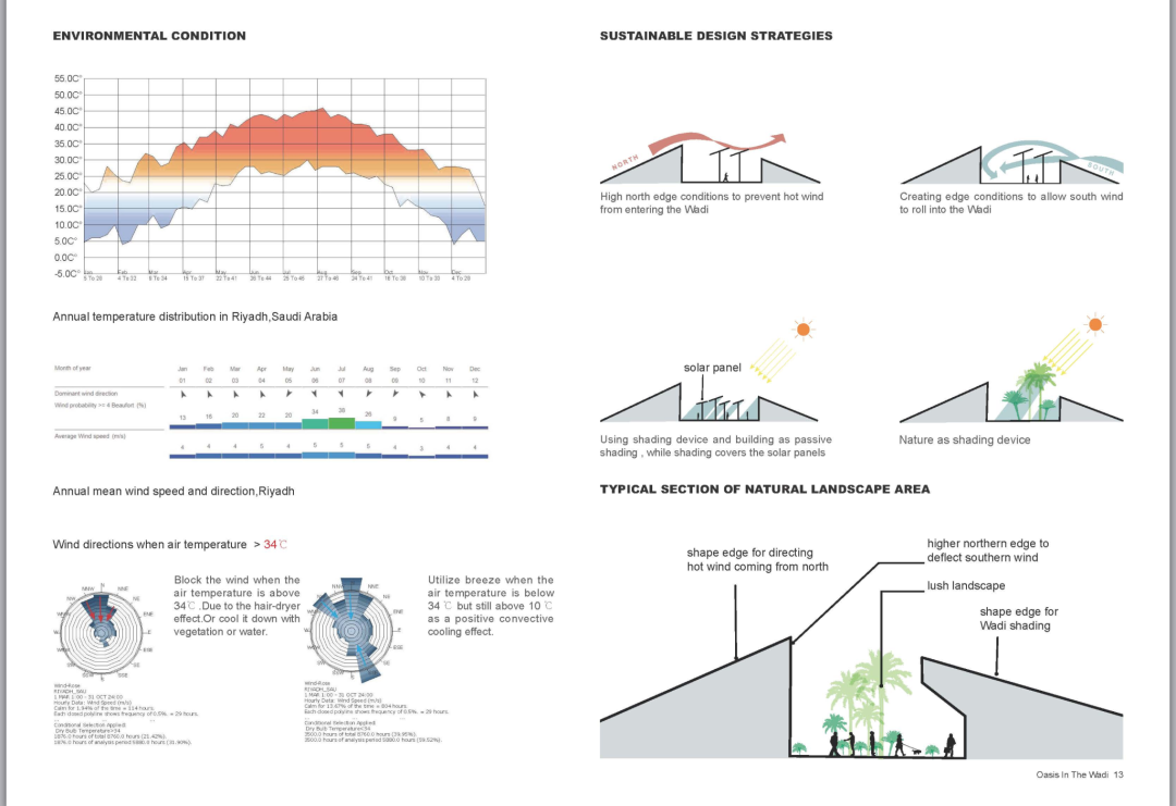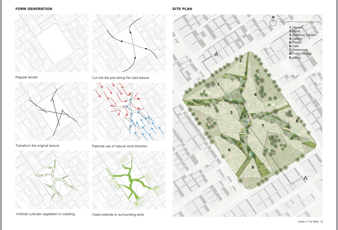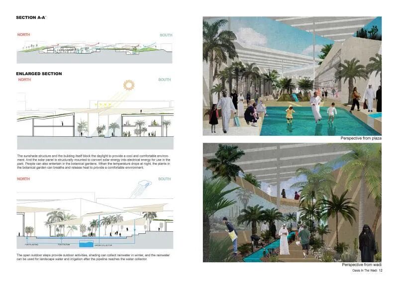 我的整个方案是以“保护弱势群体”为主线贯穿的。最喜欢的就是沙特首都利雅得沙漠绿洲公园方案,整个方案以龟裂的土地为设计元素,土地之间的裂缝作为生命的来源,在其穿插入绿植、水流赋予这片场地活力。